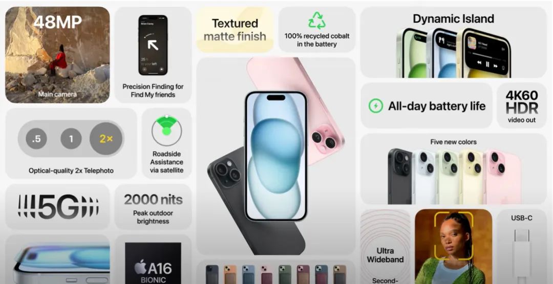 摄影方面进行了微调:iPhone 15和iPhone 15 Plus将采用4800万像素的主摄像头,可获得更高分辨率的图像,并在弱光情况下提高质量。![]()