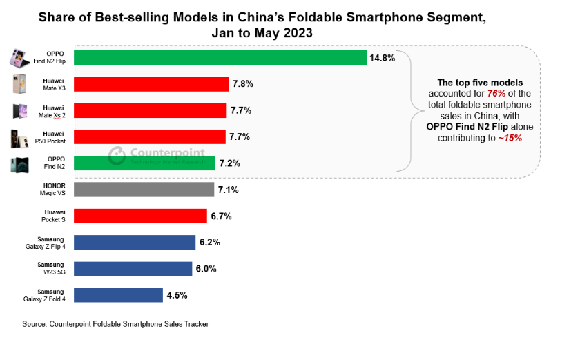 (2023年1-6月中国折叠屏手机市场销量份额 图源:counterpoint)