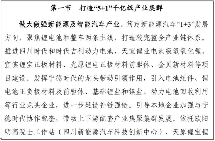 2021年,宜宾市出台“十四五”规划,提出要发展“5+1”千亿级产业集群,分别为新能源及智能汽车产业、智能终端产业、高端装备制造产业、新材料与精细化工产业、医疗器械产业以及白酒食品产业。