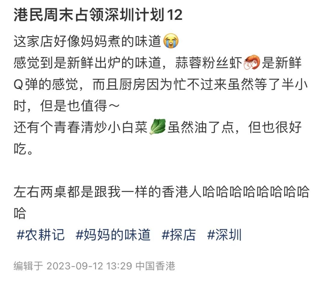 红餐网也注意到,小红书上,有香港人网友晒出了一家人在深圳餐厅的合照并配文表示:“深圳餐厅很宽敞,一张大桌完全能满足一家人聚餐的需求,同时还没有明确的用餐时间限制,用餐体验非常好。”