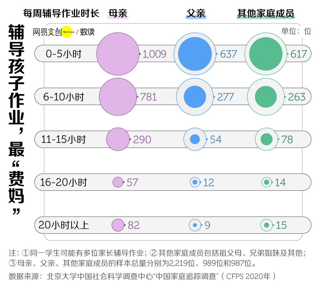 受访样本中,每周辅导作业超 15 个小时的妈妈有 429 位,可父亲和其他家庭成员只有 75 位和 107 位。
