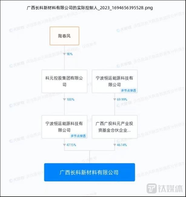 根据天眼查披露的信息显示,先是在7月份,广西长科就退出了曾经投资过的两家公司:宁波国沛石油化工有限公司(以下简称“宁波国沛”)、浙江长科新材料有限公司(曾用名浙江科元新材料有限公司,以下简称“浙江长科”),并且将两家公司转至同为陶春风旗下的公司恒运能源和科元控股,目前恒运能源100%控股宁波国沛,科元控股100%控股浙江长科。而广西长科的法定代表人也在8月12日由陶春风变为傅建立,傅建立目前还在长鸿高科担任副董事长的职位。