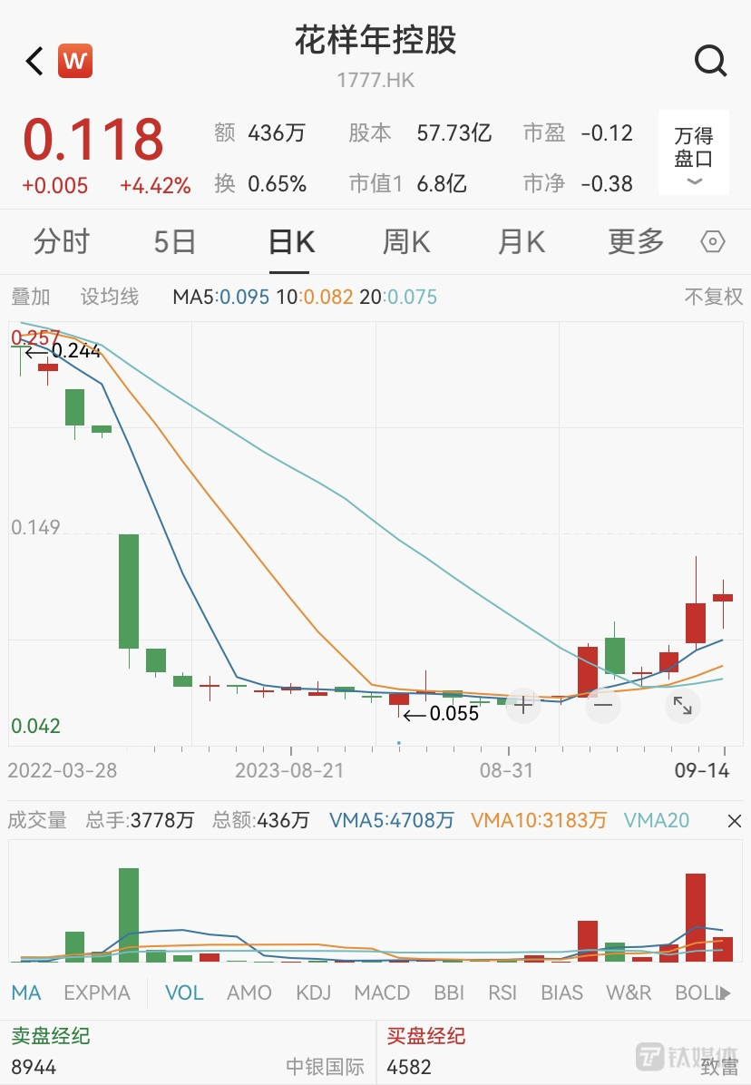 截至9月14日港股收盘,花样年控股股价报收0.118港元,涨4.42%,成交额为436.08万港元,当前公司总市值约6.81亿港元。