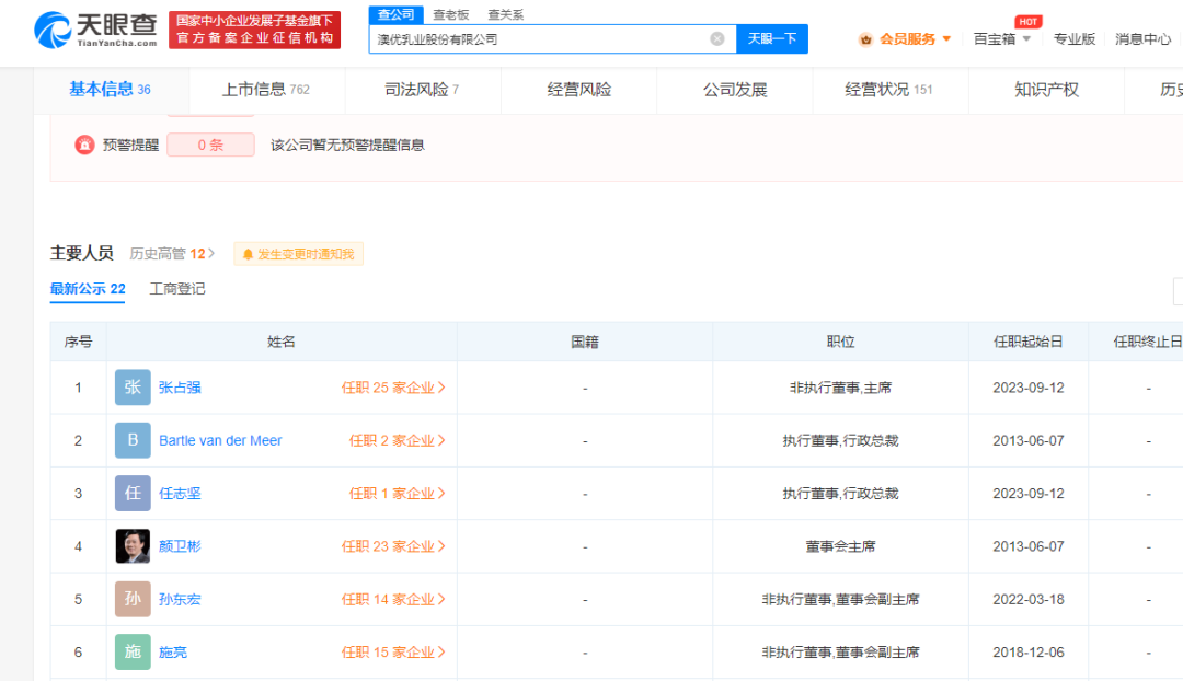 据天眼查APP显示,9月12日晚间,澳优乳业突然发布公告称,创始人颜卫彬因决定投入更多时间在其他事务的原因,已辞任公司董事局主席、行政总裁及执行董事等本公司的其他所有职务。由张占强接替颜卫彬出任澳优董事会主席职务,任志坚出任澳优行政总裁,张志出任澳优执行董事一职。