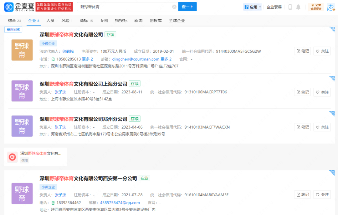 企查查显示,与野球帝相关的体育公司有8家,分布在深圳、西安、上海和郑州等地,法人均由初创团队核心人员承担,其商业版图涉及文化、广告、体育场馆、体育用品和服饰等多个领域。