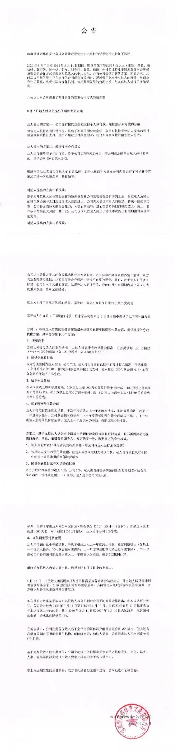 9月6日,“野球帝”在微博发布公告称,经过多轮切磋,野球帝与旗下签约的九位达人(王翔、马超、赖益烨、郭雨妍、陈一帆、郭洋、刘守元、郭昊、魏鹏)达成了新的合作模式: