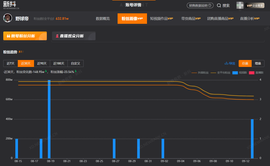 新榜旗下抖音数据工具新抖显示,最近一个月,“野球帝”掉粉达148万,相比之下,“野球帝王师傅”“别赖了马师傅”“风一样的男子郭小洋”近一个月涨粉均在60万以上,风暴中心的九位达人单月共涨粉451万。