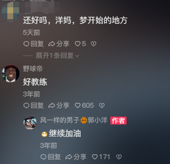 该条视频评论区下网友的“考古”和郭洋与“野球帝”的互动