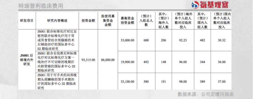 以PD-1为例,根据君实生物公布的数据,动辄3亿起步。如下图所示,联合标准化疗对比安慰剂联合标准化疗用于胃或胃食管结合部腺癌的术后辅助治疗的国际多中心III期临床研究,预计投入达到3.3亿元。