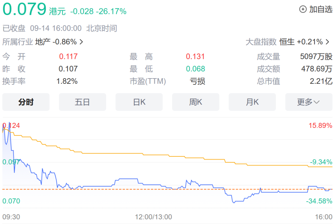 9月14日早间九时,当代置业股份恢复买卖。开盘之后,其股价一路走低,截至午间收盘,跌幅23.36%,每股0.082港元。午后股价持续下跌,收于每股0.079港元,跌幅26.17%。