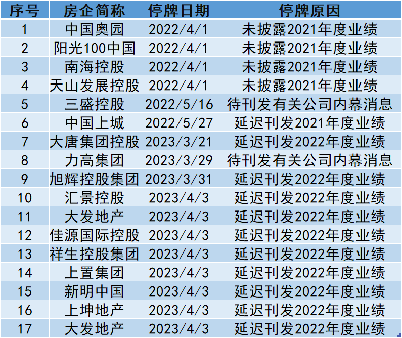 根据港交所规定,企业停牌满18个月将面临被退市风险。在2022年4月1日,一批房企因未能刊发2021年报而被停牌,今年9月底则是最后期限。