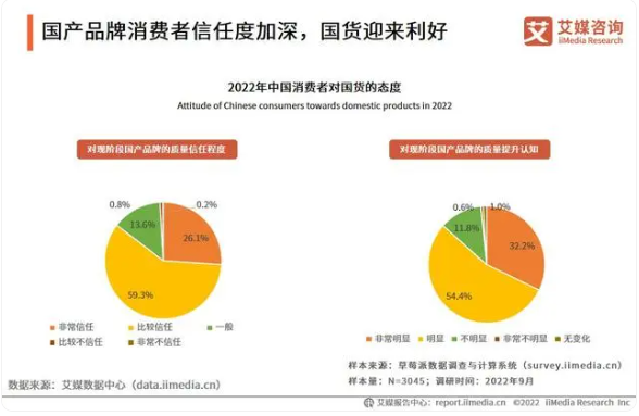 根据艾媒咨询此前发布的《2022年中国新国货消费行为监测与商业趋势研究报告》调研数据显示,有85.4%的消费者信任国货质量,86.6%的消费者认可质量提升。民众对于国家和民族认同感日益提升,也使其对国货品牌和商品的支持度提高。与此同时,消费者购买的国产商品品类覆盖较广,涉及衣食住行多个领域,其中综合服装以及小型家电是中国消费者更偏好购买的品类。