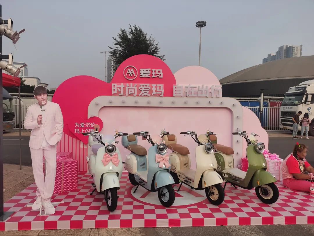 不只是抖快两家,在水滴门前的广场上,咪咕音乐展示自家巨大的立牌,用广播喊着“周杰伦正版周边”,还有薅了周杰伦流量多年的爱玛电动车也在门前摆起了粉红色的展台。