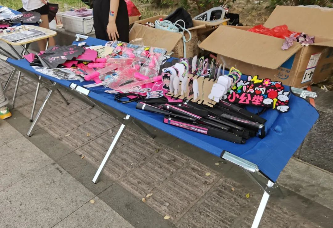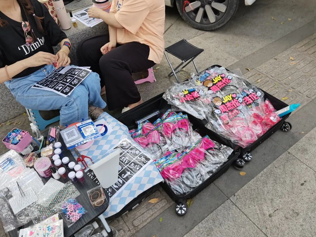 商贩们之间,分成了“个体户”和“打工人”两派。“个体户”的摊主们往往是自己进货当老板,一般两三个人。他们用行李箱拉货,行李箱展开就是一个摊位,里面摆满了周杰伦的扇子、头灯、贴画等。摊主们坐在小马扎上,一边生涩地开口吆喝,一边等着顾客来光顾。