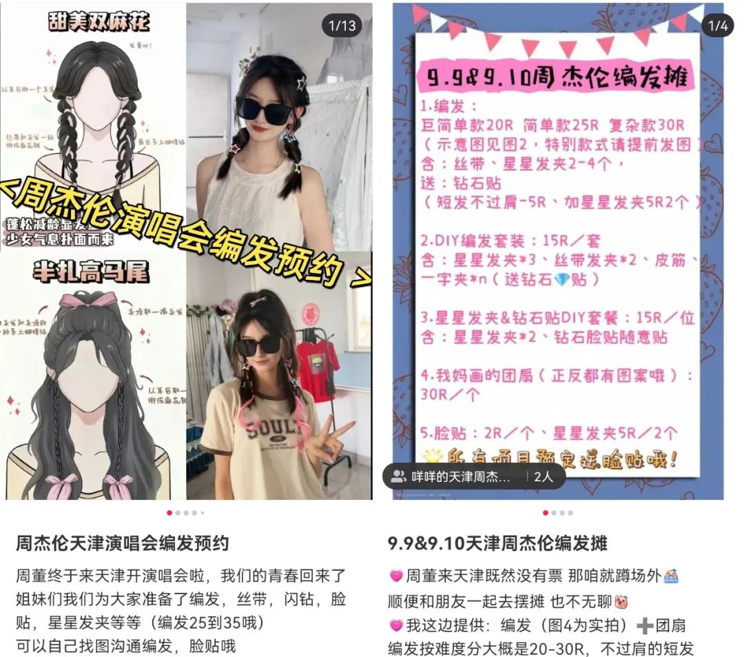 一位编发的摊主告诉拓品新消费,自己一整天的收入将近850元,除去与三位朋友的分成和进货成本,一天能挣250元左右。同时,她还在小红书上发布了自己的摊位信息,接受预约,光是预约的单量就排满了一整个下午。