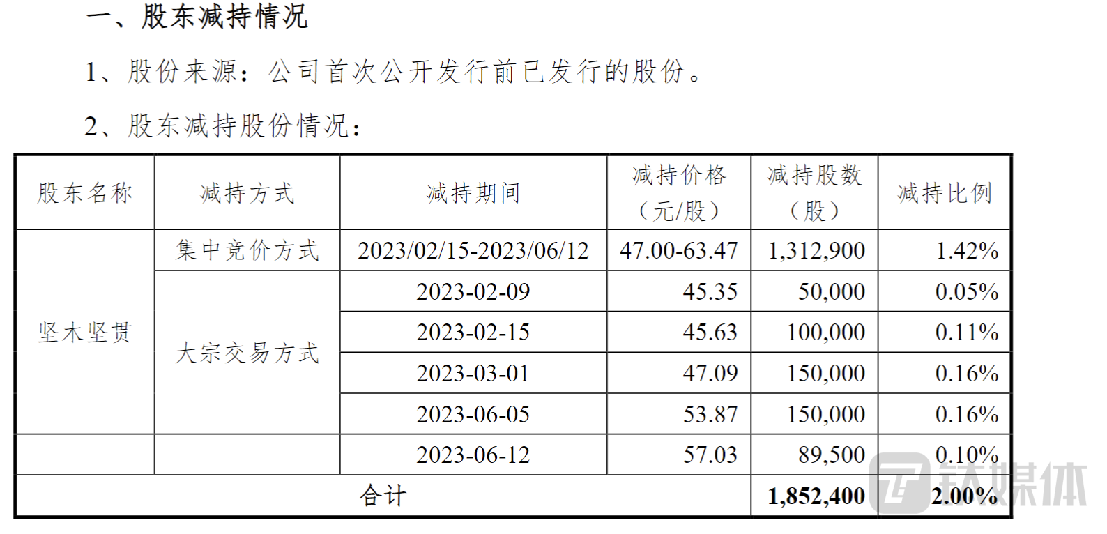 截至7月7日,坚木坚贯已经减持176万股股份,减持比例为1.9%,此次套现金额为1.27亿元。目前,坚木坚贯的持股比例已降低至0.98%。经计算,坚木坚贯两次共减持金额不低于2.16亿元。