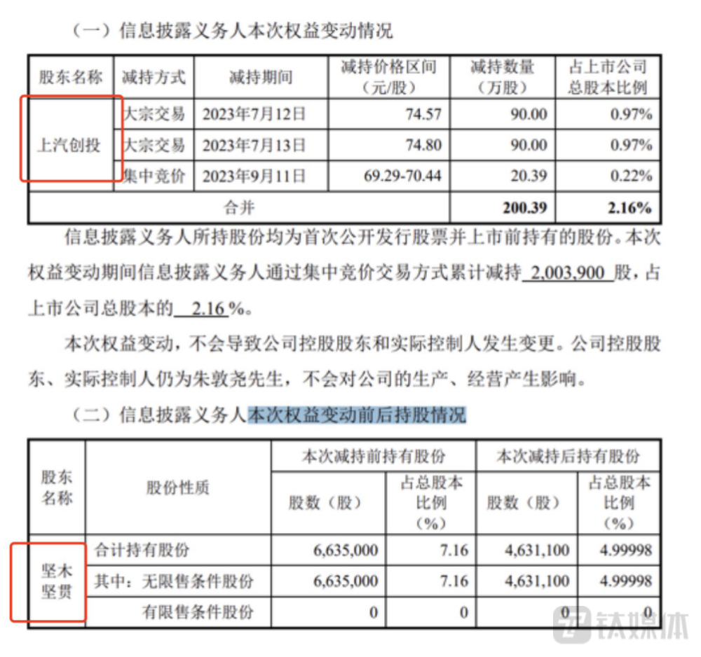 随后,上汽创投在7月至9月期间通过大宗交易以及集中竞价的方式累计减持公司股票200.39万股,占当前总股本的2.16 %,上汽创投套现金额不低于1.41亿元。