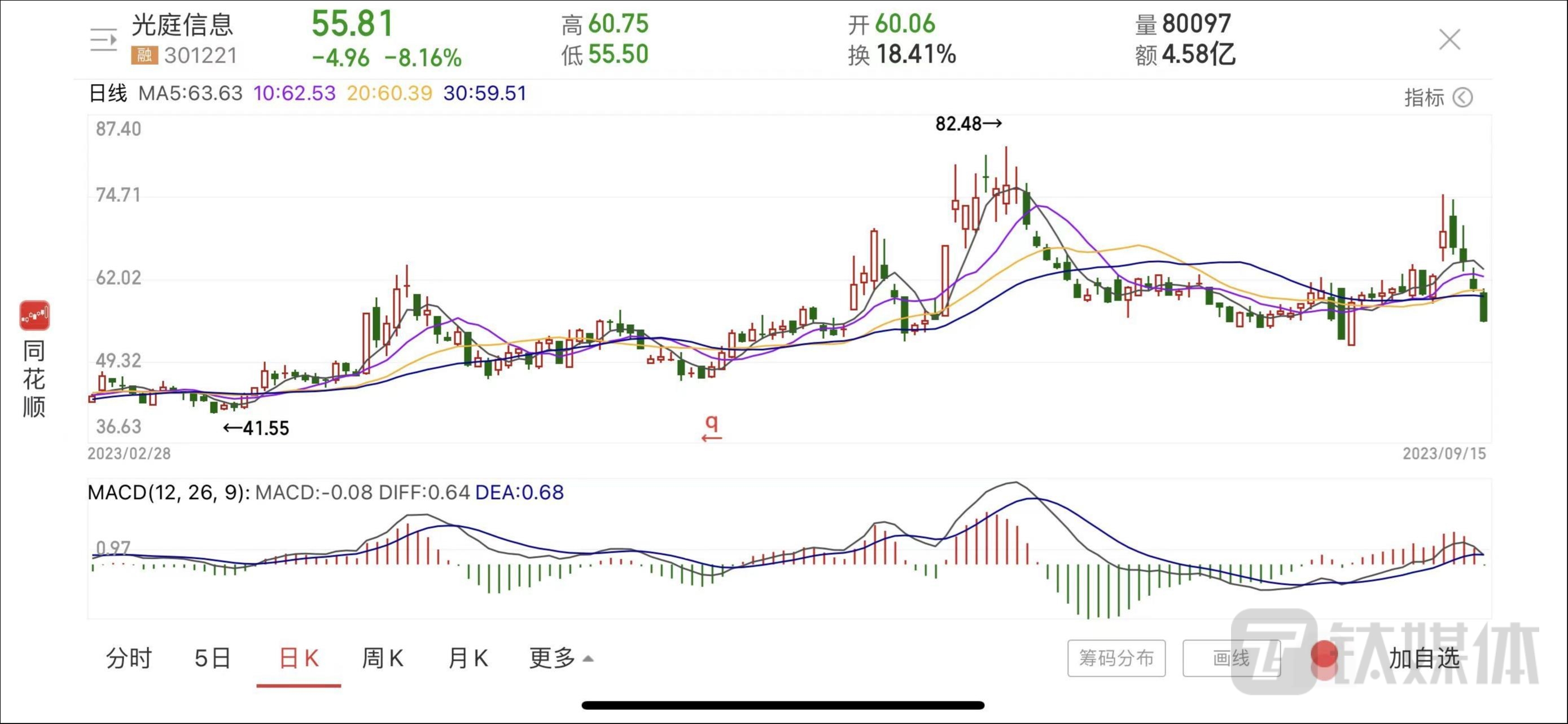 二级市场方面,受股东减持影响,公司股价在9月15日低开低走,截至今天收盘,公司股价报收55.81元,跌幅8.16%。而此前,光庭信息股价已连续下跌3个交易日,目前累计跌幅约21%,公司当前总市值为51.69亿元。(本文首发钛媒体App,作者|李若菡)