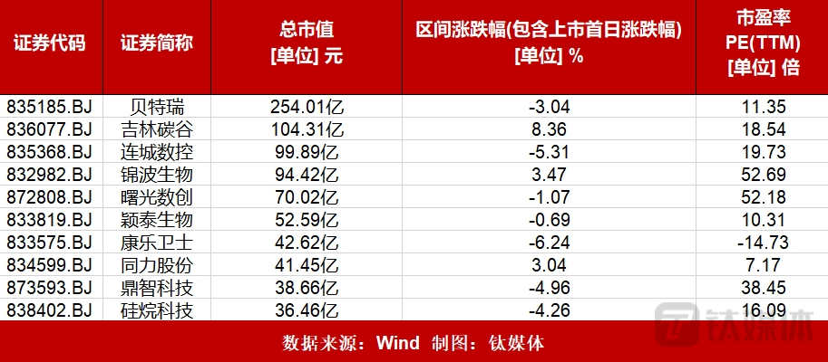 个股方面,北交所市值排名前十的个股仅有三只上涨,分别是吉林碳谷涨幅8.36%;锦波生物涨幅3.47%;同力股份涨幅3.04%;下跌的有:“市值一哥”贝特瑞跌幅3.04%;连城数控跌幅5.31%;曙光数创跌幅1.07%;颖泰生物跌幅0.69%;康乐卫士跌幅6.24%;鼎智科技跌幅4.96%;硅烷科技跌幅4.26%。