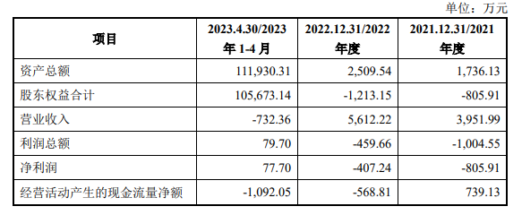 从发展历程来看,南充发展成立于2021年4月,至今仅两年多。不过南充发展的业绩表现并不出色,2021年及2022年,其连续两年处于亏损状态,2023年1-4月净利润也仅为77.7万元。