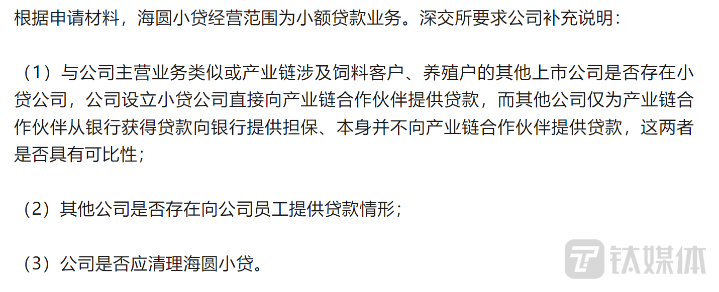 资料显示,海圆小贷在2018年7月正式成立,由公司以自有资金5亿元独资设立。按照公司的说法,海圆小贷的主要业务为向与公司保持良好业务关系、具有较好信誉和一定实力的饲料客户、养殖户提供资金贷款服务。但从深交所的问询看,海圆小贷还存在向员工提供贷款的情形。