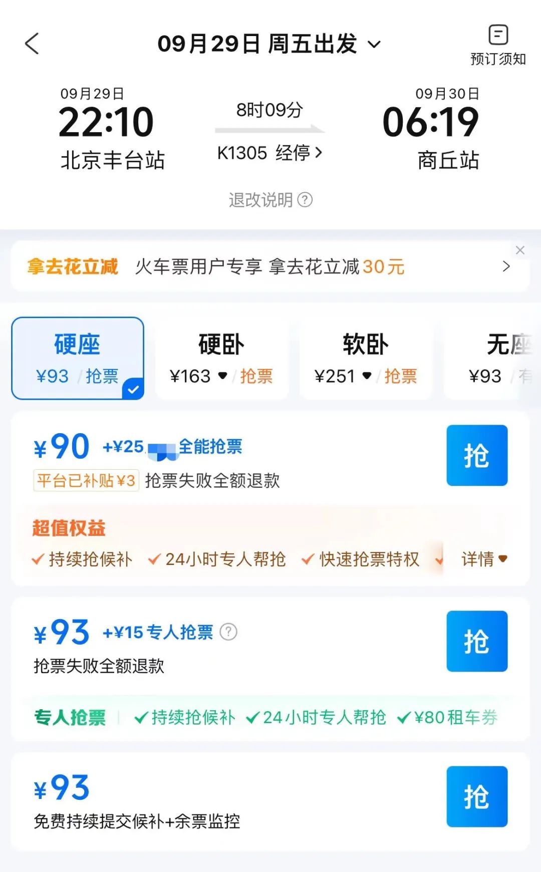 第三方平台“加速抢票”花样百出:低速、高速,还有光速……93元车票最高加价62元,花钱真能增加抢票成功率?