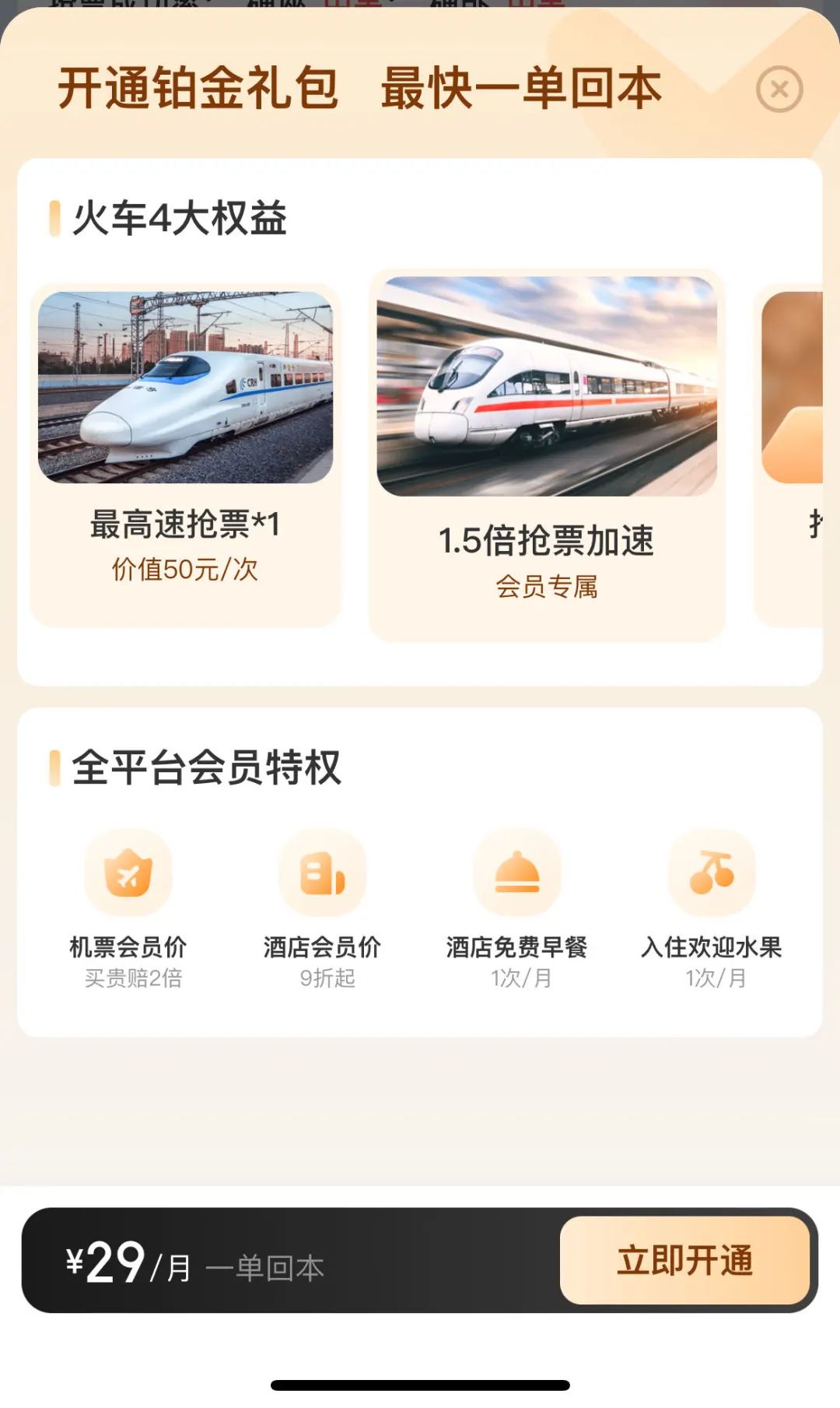 平台C有所谓的会员月卡,介绍是开通后享有“最高速抢票一次”、“1.5倍抢票加速”等。