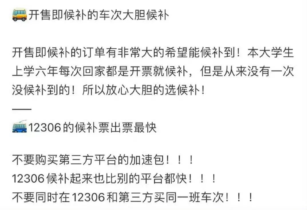 他总结12306的候补出票最快,还建议不要购买第三方的加速包。