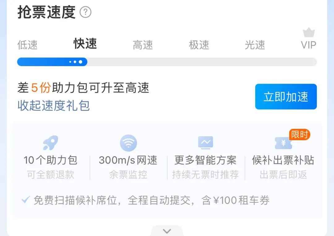 不要再花钱加速了,也别叨扰朋友“砍一刀”了,赶紧多候补几个车次或许才最有效,也最省心。