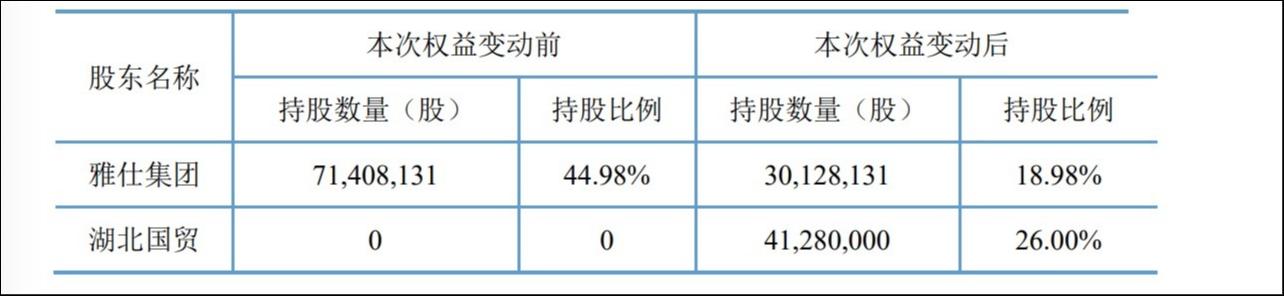 该笔交易完成后,上海雅仕的控股股东将变为湖北国贸,实控人由孙望平变为湖北省国资委,雅仕集团的持股比例将从44.98%降低至18.98%。