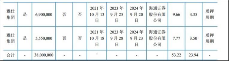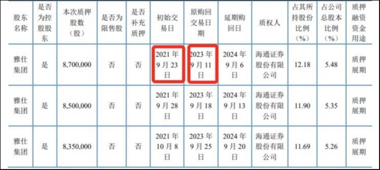 此后,雅仕集团的质押风险并未解除。据披露,雅仕集团近日办理了股份质押展期一年,该轮质押初始交易日在2021年9月或10月,原购回交易日期是在2023年9月。追溯时间线可以发现,雅仕集团两次卖壳计划提出的时间点与其最近一轮股份质押期开始和结束的时间重合。目前雅仕集团累计质押的股份占其持股的比例为53.22%,占上海雅仕总股本的23.94%。