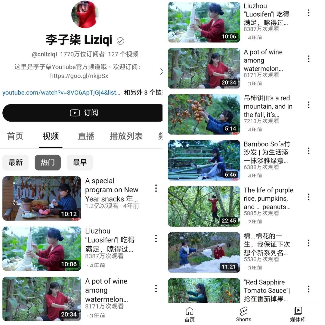 不过,有趣的是,尽管在中文社交媒体掉粉,但在YouTube上,李子柒的粉丝数反而从1500万增加到了1770万,两年时间增长了270万。她在YouTube首页置顶的一条有关年货小零食的特辑,观看次数已经达到了惊人的1.26亿次。