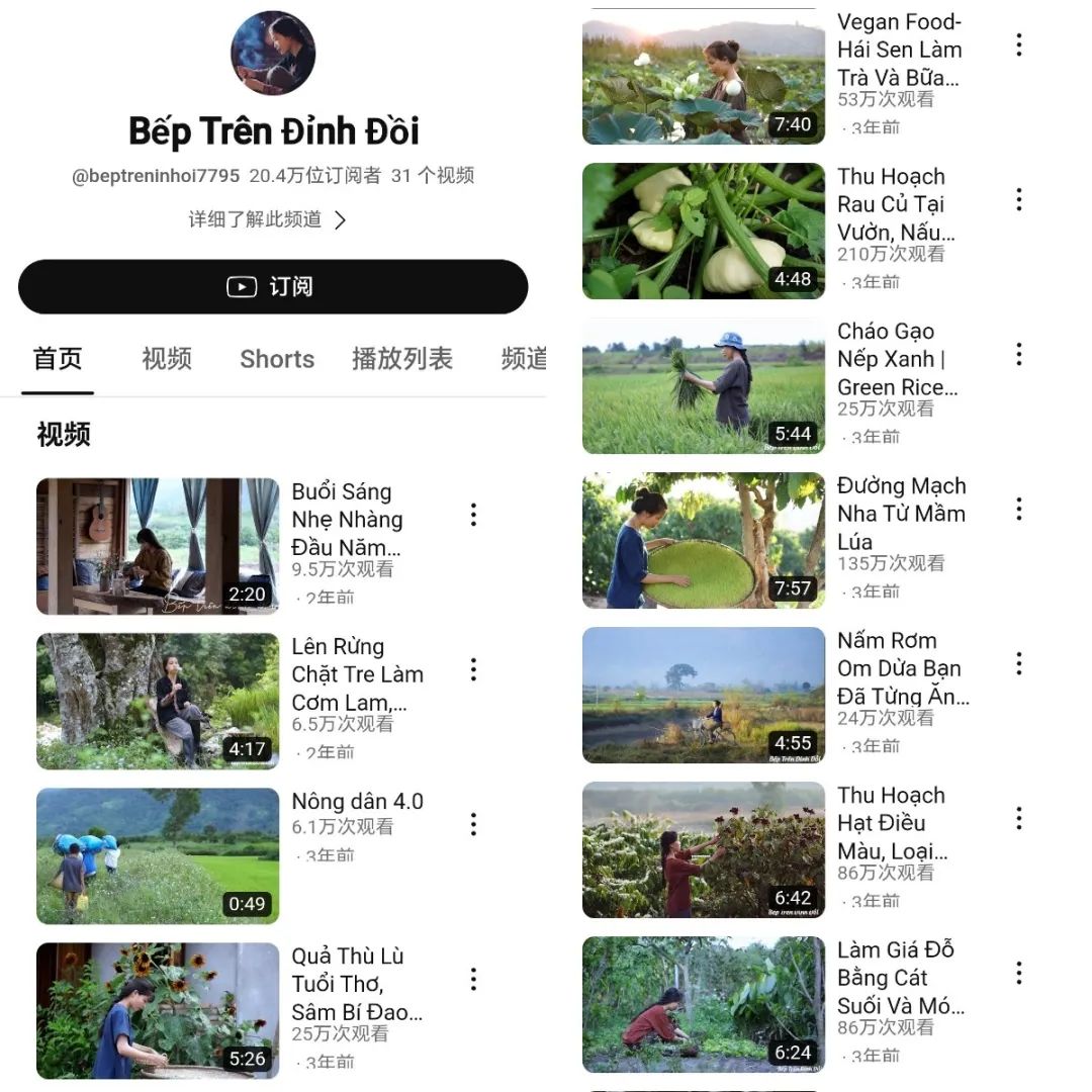 一个著名的例子,就是在YouTube上有20万粉丝的越南网红Bep Tren Dinh Doi。无论是在视频内容还是在造型上,她都可以说是李子柒的“高仿”。但在发布了31个视频之后,她停止了更新。一个原因,或许是流量不佳。Bep Tren Dinh Doi停更前的一条视频,流量只有9.5万。