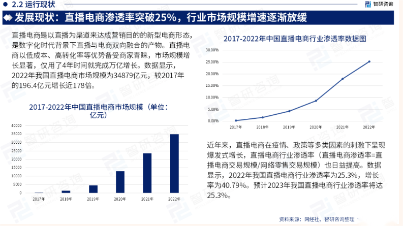 而直播带货确实是一块诱人的蛋糕——智研趋势《2023年中国直播电商产业现状及发展趋势研究报告》显示,2022年中国直播电商市场规模为3.48万亿元,较2017年的196.4亿元增长近178倍。