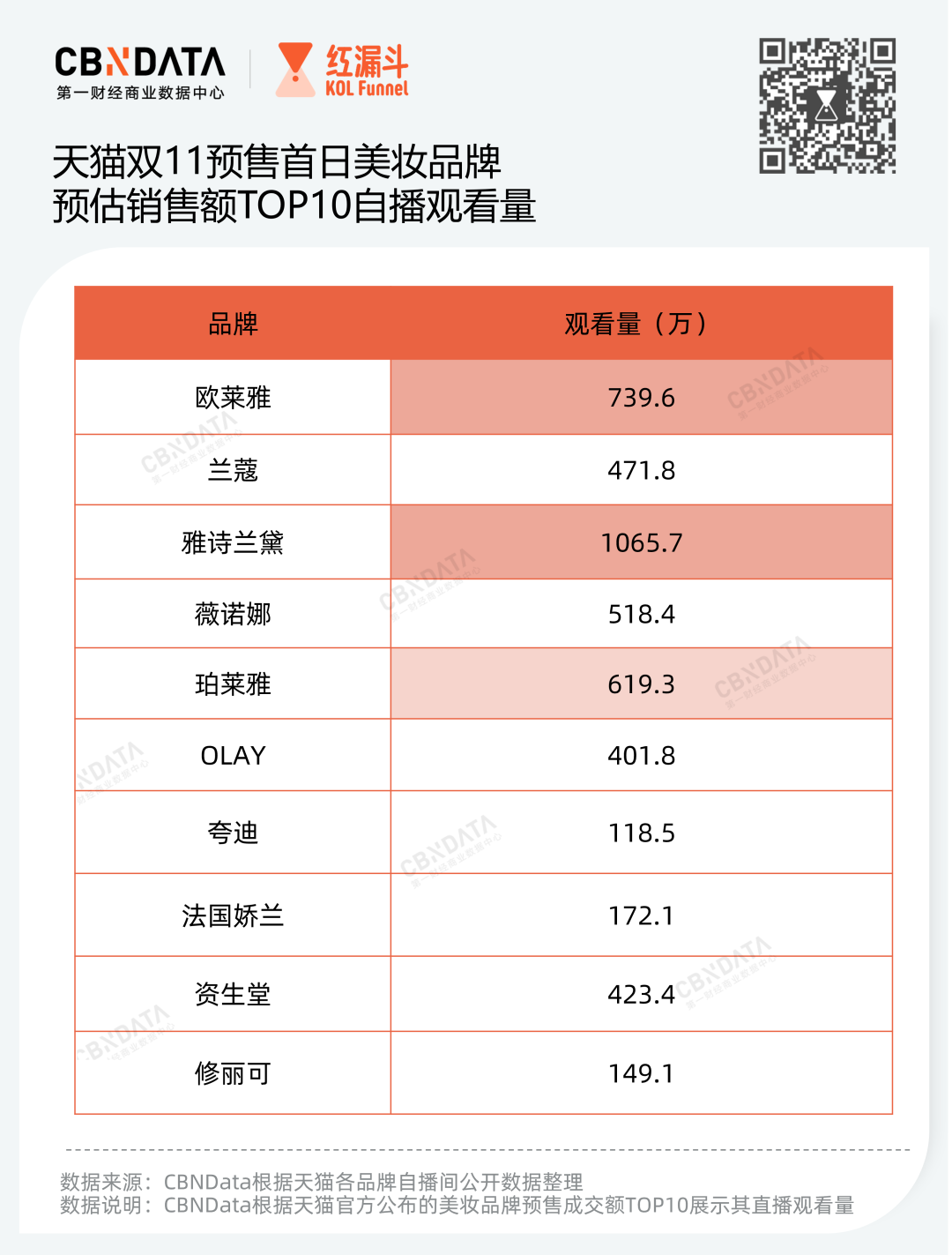 以李佳琦的基本盘美妆为例,在去年双十一预售首日,雅诗兰黛的品牌自播观看量已经超过千万,欧莱雅、珀莱雅、薇诺娜等品牌也都有大几百万的观看。