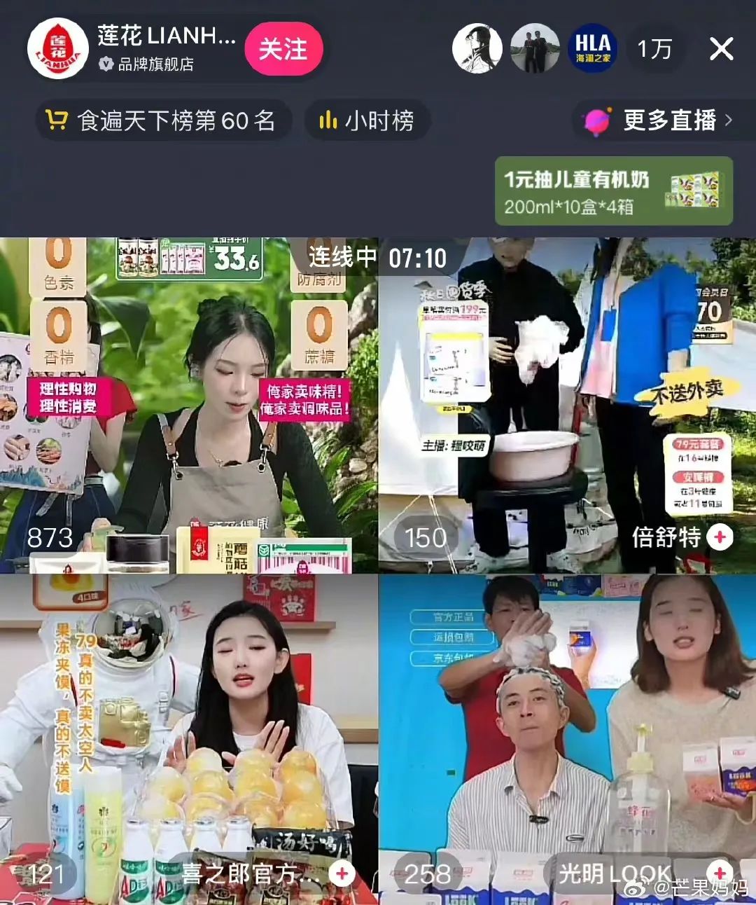 其他直播间,如蜂花、倍速特、光明LOOK、喜之郎、白象方便面等国货品牌也都参与到国货狂欢之中,他们将友商甚至竞品的商品摆上自家直播间的台前,连麦互相为对方带货,将这一波国货的情绪推向了顶峰。