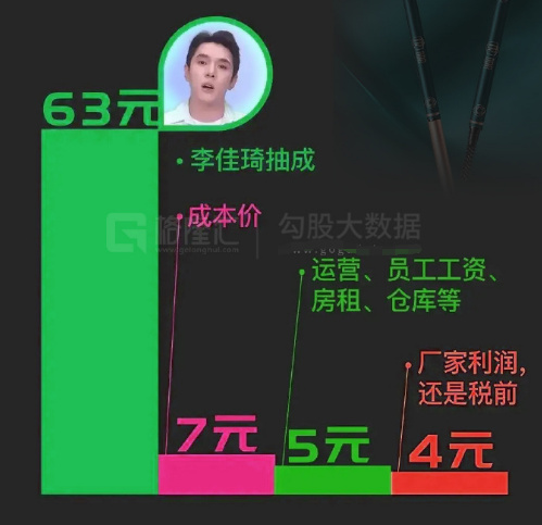 该图片显示,一只售价79元的花西子眉笔(直播时包含两支替换芯,不知道该成本核算是否包含),厂家税前利润4元;运营、仓库、房租、员工工资等成本5元;原材料等成本7元。但李佳琦抽成却高达63元,占比79.74%。