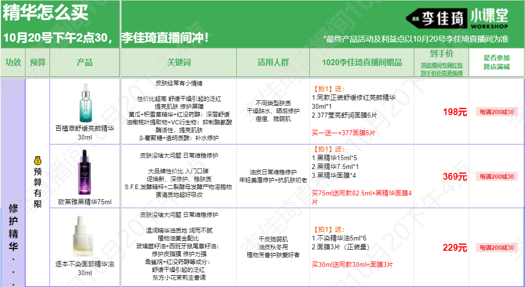巅峰时候,消费者会在双十一为李佳琦直播间单独出一份攻略,他也曾将自己直播间的各种优惠做成一张几十页的Excel表,明明白白告知粉丝何时蹲点、如何下单、如何凑满减....