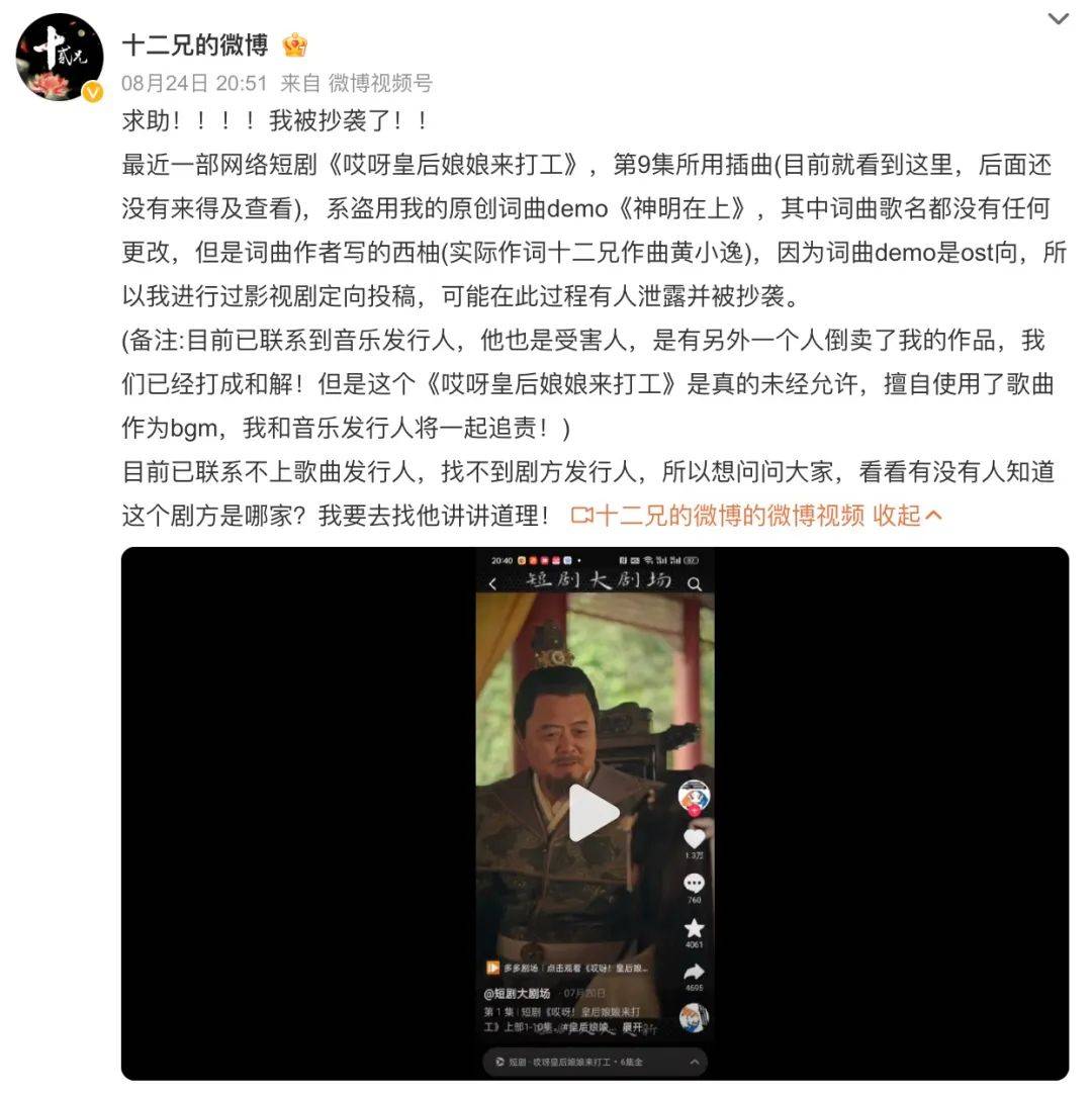 最近微博音乐博主「十二兄」发博表示,《哎呀!皇后娘娘来打工》第9集插曲疑似盗用了他的原创词曲demo《神明在上》。他进一步解释称,这首OST向demo曾被他拿去进行影视剧定向投稿,它很可能在此过程中被泄露并被挪为它用。