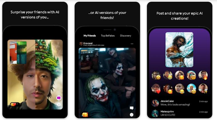 如果你此前曾经使用过国内的“妙鸭相机”,那你可能会更好地理解什么是“BeFake”。这同样是一款允许用户借助AI生成图像的App,但产品如其名,BeFake并不以生成更接近现实自我的图像为目标,相反,BeFake鼓励用户生成完全“虚幻”的图像。除此之外,相比“妙鸭相机”,BeFake增添了社交功能,用户可以直接在App内分享自己的AIGC杰作。因此,概括而言,BeFake是一款结合了AI技术与图片社交的“新品种”。