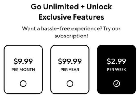 相应的,BeFake还采取了付费订阅的盈利模式。用户在刚下载BeFake时会免费获得150个积分,每使用AI生成一次图片将花费3个积分,付费订阅将享受匿名、隐藏原始照片、迟发照片、每日额外发送一次照片等特权,目前的订阅费用是每周2.99美元、每月9.99美元或者每年99.99美元。