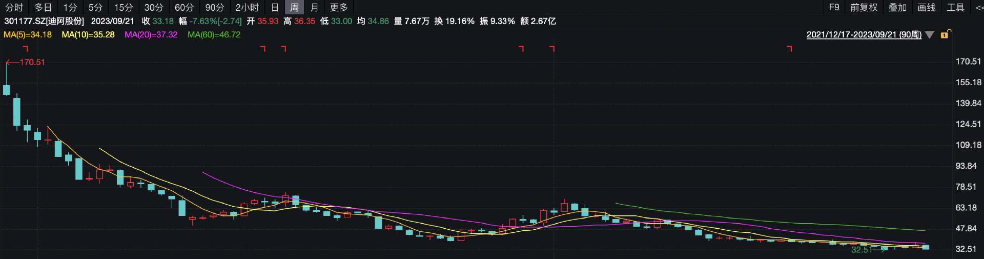 上市首日,迪阿股份的股价一度涨至177.0元/股(前复权),但现在却只剩下不到35元/股,两年时间已较历史高点跌去80%。