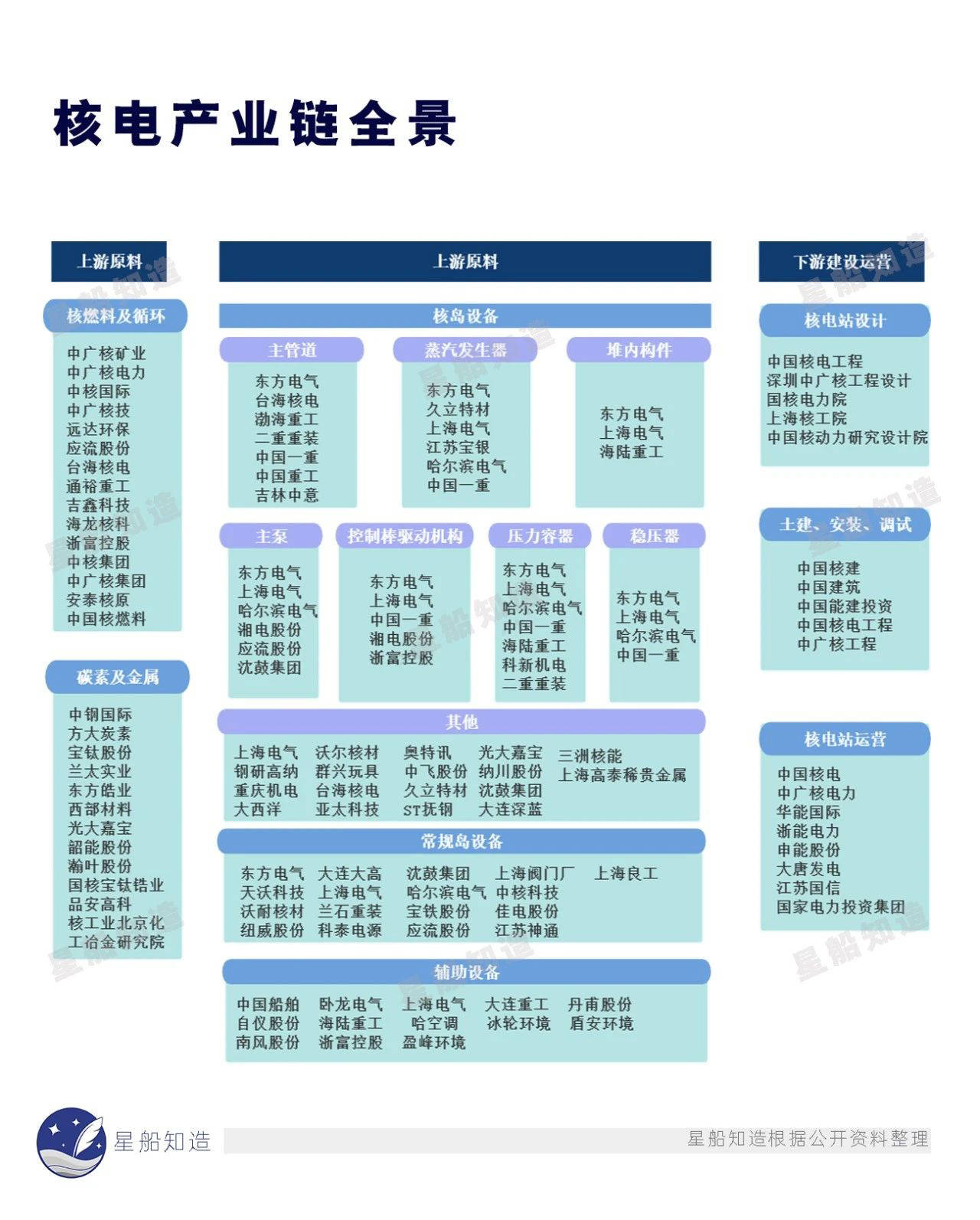 产业链看,核电上游为核燃料、核电设备制造;中游是核电站运营管理;下游主要是核电设施延伸出的各类业态。