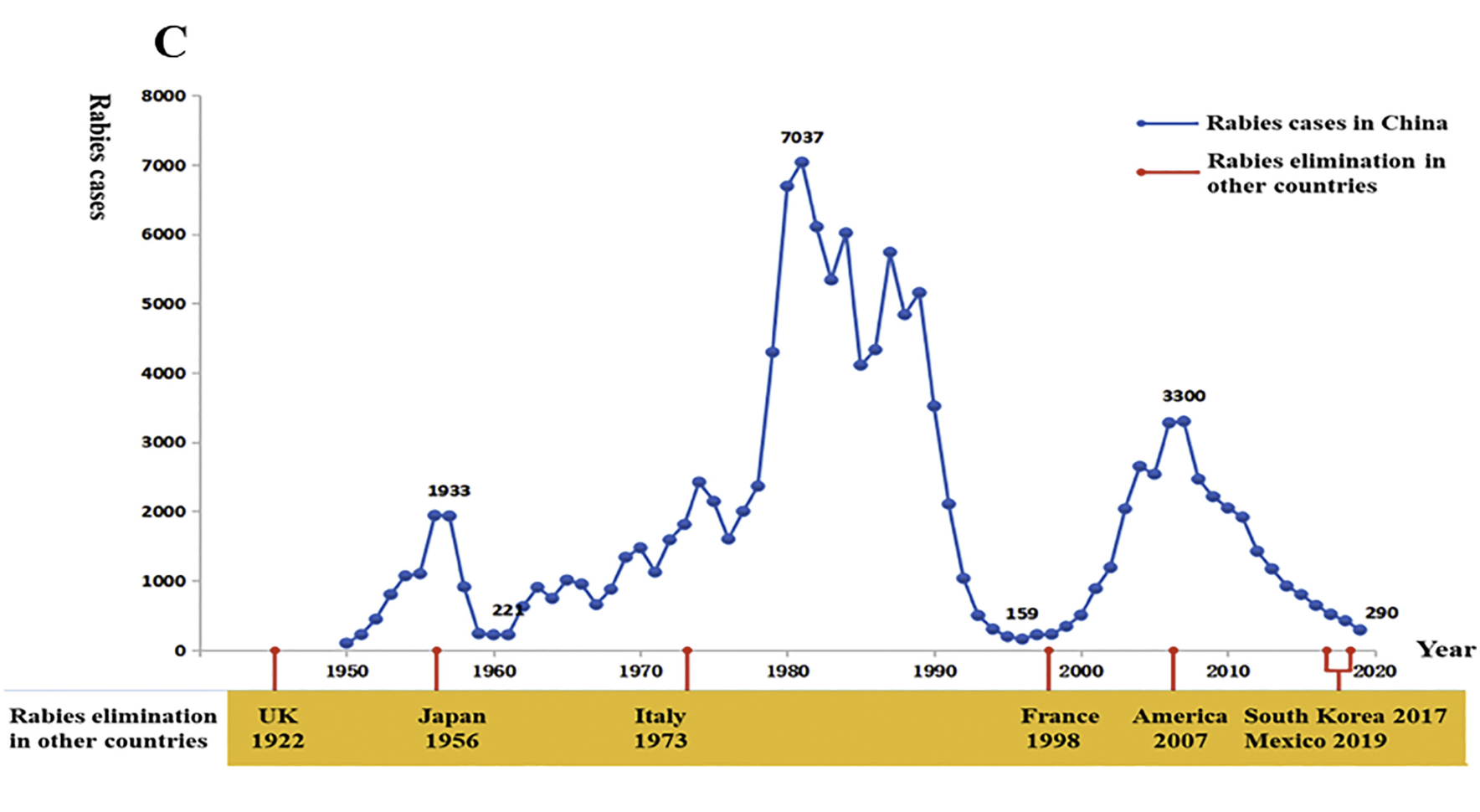 中国狂犬病发病率(蓝线)vs 世界上消除狂犬病的国家(下方) / [8]
