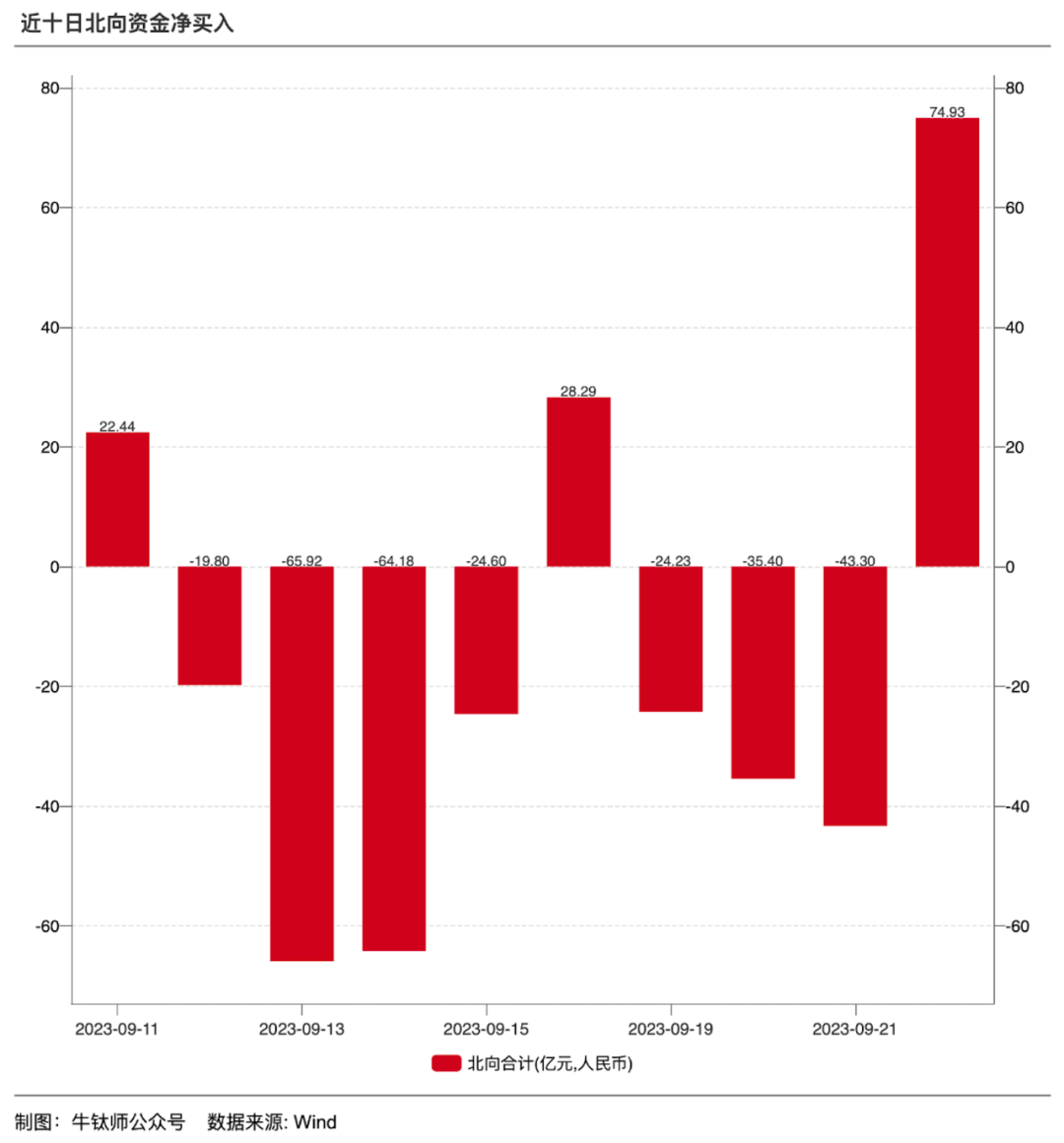 今日北向资金全天成交金额1131.23亿元,占A股总成交额的14.79%。北向资金当日净买入74.93亿元;其中,沪股通净买入33.13亿元;深股通净买入41.79亿元。据Wind数据,近十日北向资金有七日为净卖出。