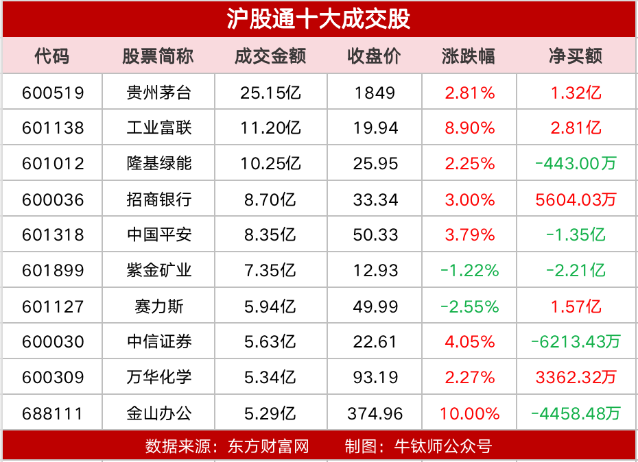 个股方面,沪股通成交额最高的个股为贵州茅台,成交额达25.15亿元,净买入1.32亿元,收盘涨2.81%。其次是工业富联,成交额为11.20亿元,净买入2.81亿元,收盘涨8.90%。