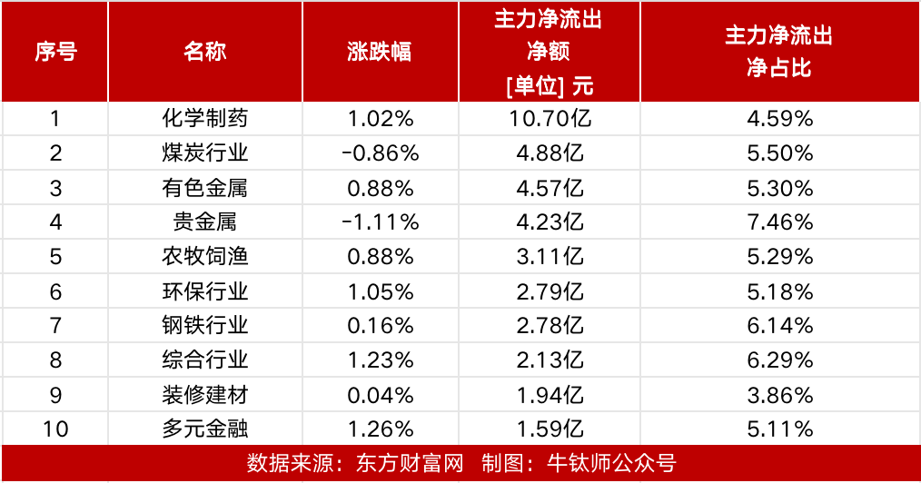 主力资金净流出前十板块中化学制药、煤炭行业和有色金属流出金额最多,分别达到10.70亿元、4.88亿元和4.57亿元,此外贵金属、农牧饲渔、环保行业、钢铁行业、综合行业、装修建材和多元金融同样资金流出规模居前。