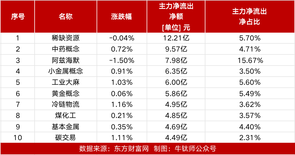 今日稀缺资源板块主力资金流出最多,中药概念、阿兹海默、小金属概念、工业大麻、黄金概念、冷链物流、煤化工、基本金属和碳交易也是主力资金流出较多的概念板块。
