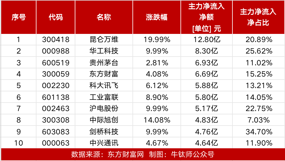 从个股来看,根据东方财富数据,今日有2409个股获主力资金净流入,其中,71股获主力资金净流入超1亿元。昆仑万维获主力资金净流入最多,净流入金额为12.80亿元。该股今日收盘20%涨停,成交额61.29亿元,换手率16.07%。
