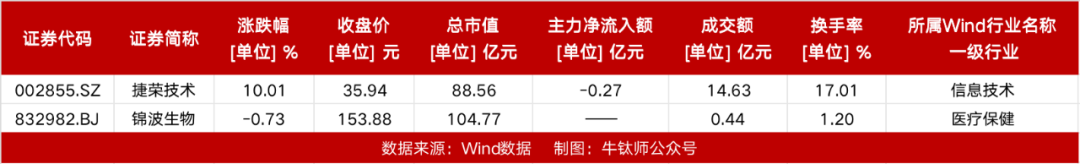 除了今日发行新股外,共有2只个股盘中创历史新高。从行业属性来看,信息技术和医疗保健行业各1只。截至收盘,捷荣技术涨停,报收35.94元,换手率为17.01%,总市值88.56亿元。